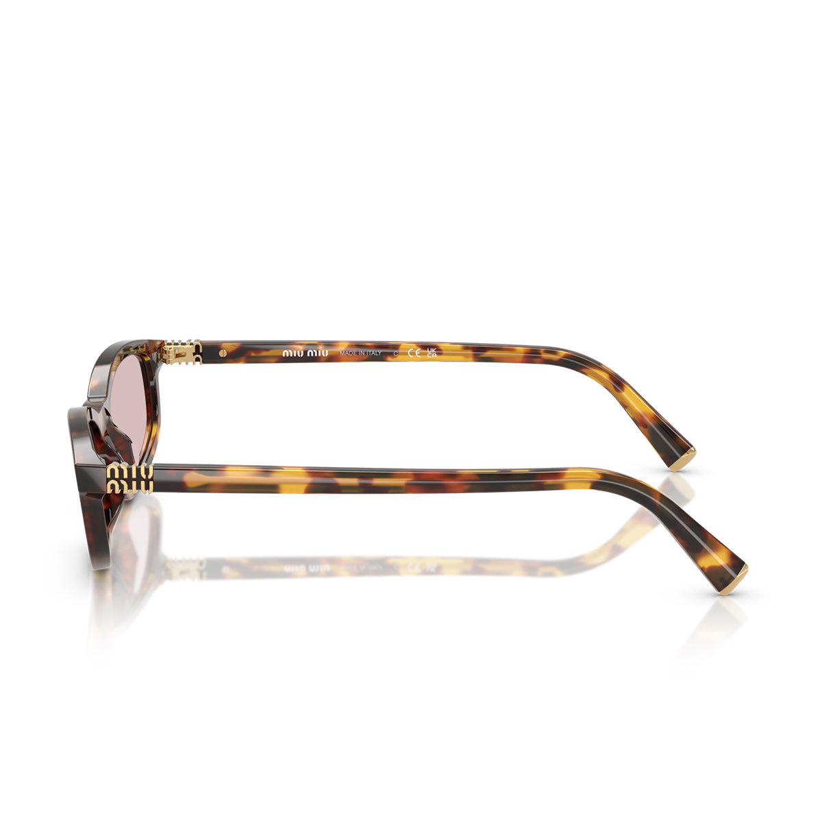 Konstrukcja jest ozdobiona ikonicznym metalowym logo Miu Miu umieszczonym pionowo, które harmonijnie integruje się z zawiasem, stając się elementem funkcjonalnym, a także dekoracyjnym. Cienkie zauszniki z acetatu zapewniają wygodne dopasowanie i wyrafinowany wygląd, dostępne również w wersji full-fit dla większego komfortu.