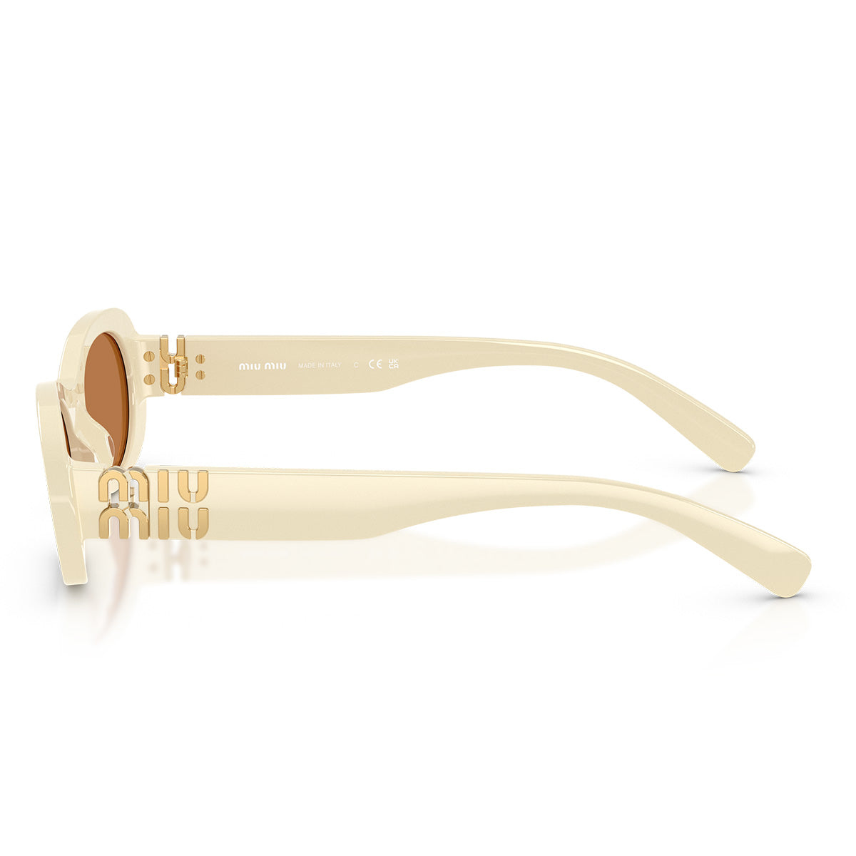 Wąski owalny design jest dostępny w ponadczasowych kolorach acetatu, takich jak czarny i biały z ciemnoszarymi soczewkami, lub miodowy havana z brązowymi soczewkami. Metalowe detale wzbogacają model, w tym regulowane noski i pionowe logo Miu Miu, które pełni również funkcję zawiasu na szerokich zausznikach.