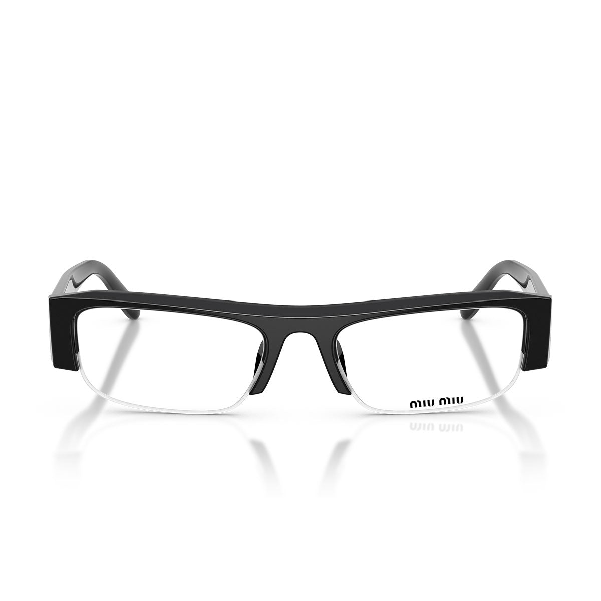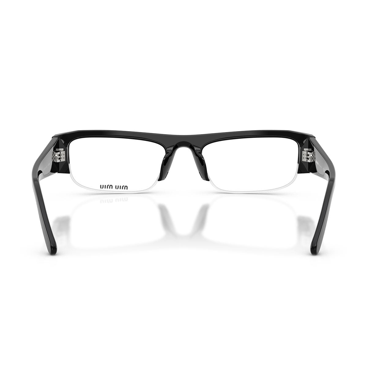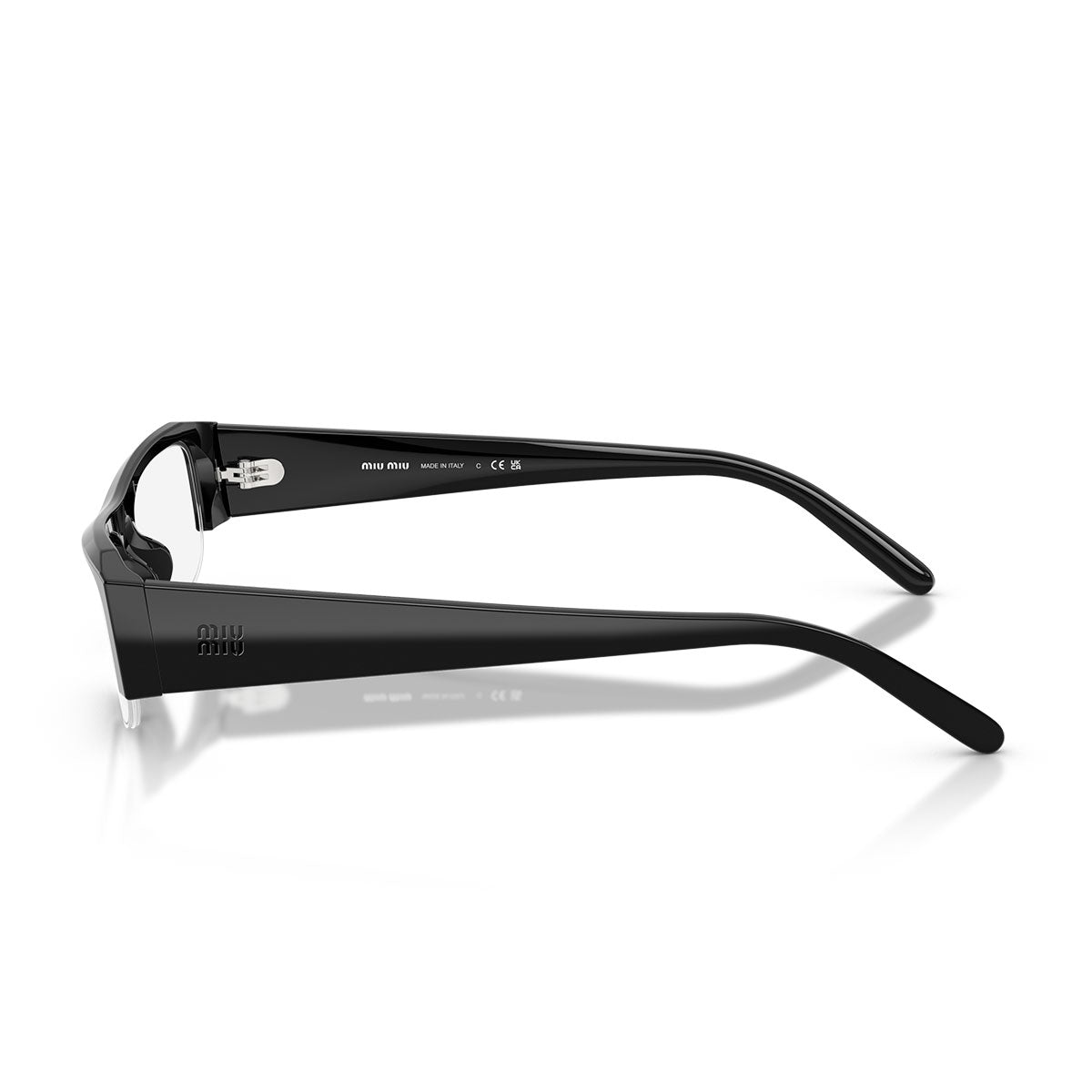 Cienkie zauszniki, ozdobione pionowym logo Miu Miu z pozłacanego metalu, dodają blasku bez obciążania wyglądu, zachowując czystą i nowoczesną estetykę.