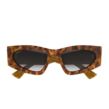 Okulary przeciwsłoneczne Gucci GG2040S ucieleśniają śmiałą i wyrafinowaną estetykę, stworzoną dla kobiety, która lubi wyróżniać się osobowością i stylem. Oprawa z acetatu o znaczącej grubości podkreśla wzór i umożliwia umieszczenie metalowego logo Gucci z boku na obu zausznikach, po prawej i lewej stronie, tworząc ikoniczny i natychmiast rozpoznawalny efekt.