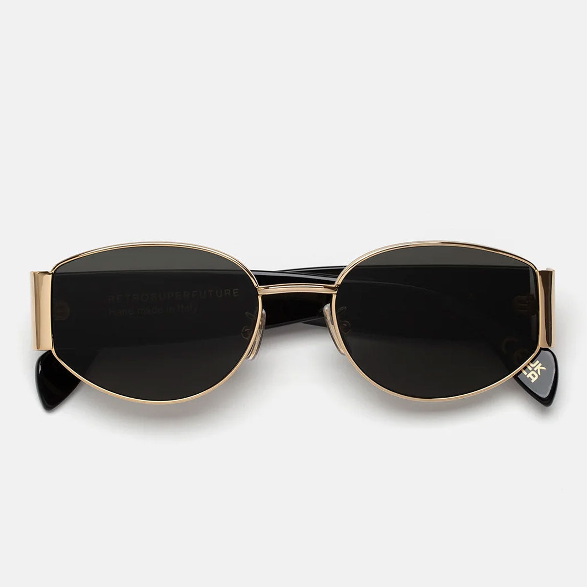 Okulary przeciwsłoneczne RetroSuperFuture X ucieleśniają doskonałą równowagę między nowoczesnym luksusem a rzemieślniczą precyzją. Wykonane ręcznie we Włoszech, łączą wysokiej jakości błyszczący złoty metal oraz czarny włoski acetat w wyrafinowanym i ponadczasowym designie. Soczewki Zeiss extra black o bazie 2 zapewniają skuteczną ochronę przeciwsłoneczną i zdecydowany styl, idealny dla tych, którzy szukają ekskluzywnego dodatku o silnym charakterze. Charakterystyczna elegancja marki RetroSuperFuture przejawia się w każdym detalu.