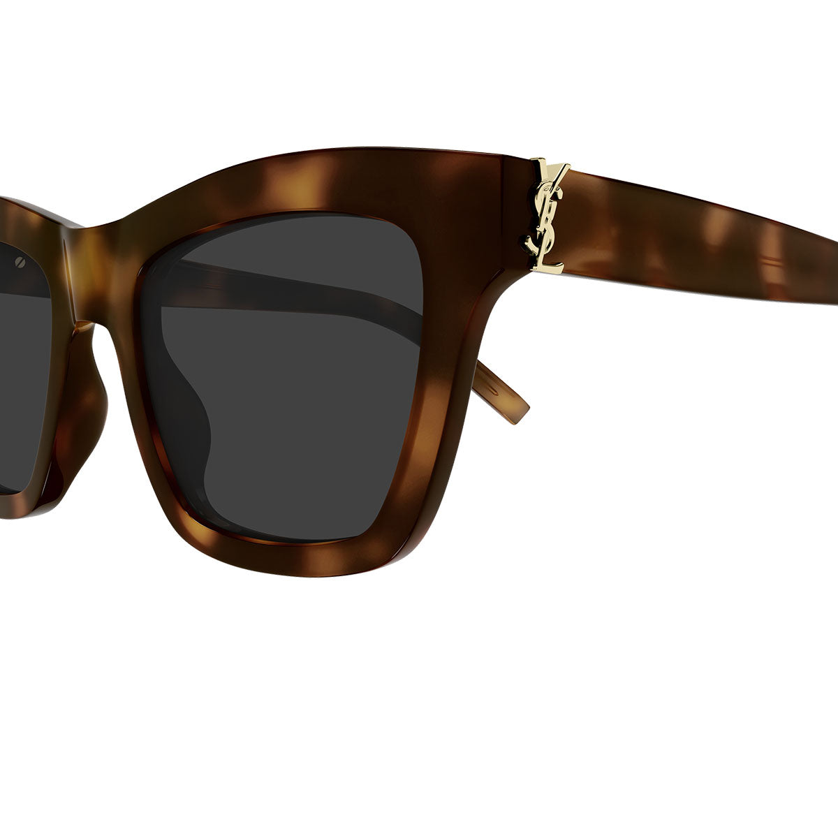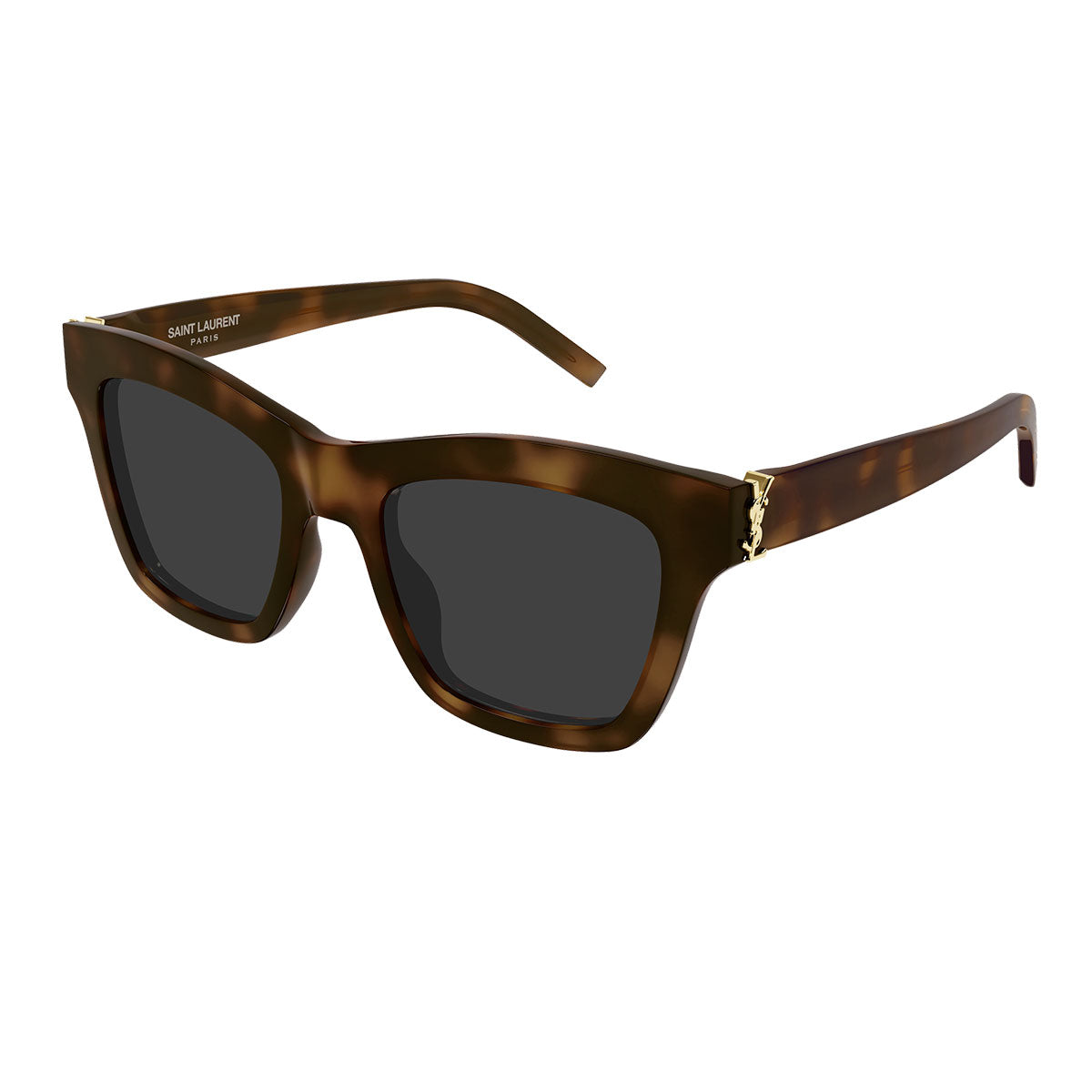 Oprawa jest całkowicie wykonana z octanu, o kształcie kociego oka, który podkreśla spojrzenie i nadaje twarzy charakteru. Głównym elementem jest Monogram M, wkomponowany w średniej wielkości zawias z logo YSL, cenny i natychmiast rozpoznawalny detal.
