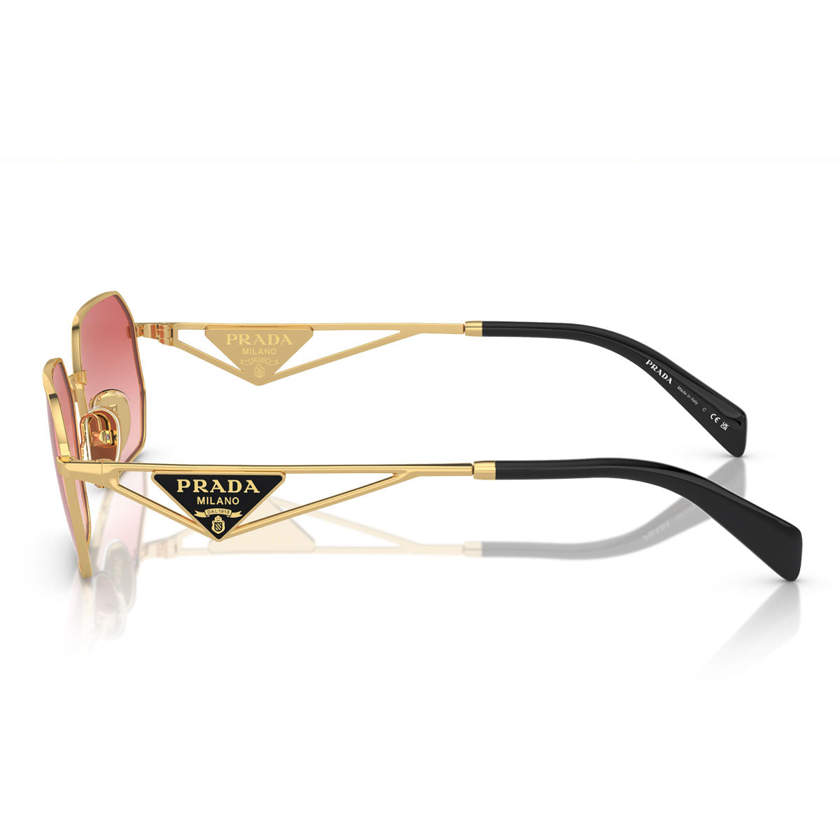 Hier sind die Prada Sonnenbrille PRA51S 5AK40C, ein Modell, das Originalität und zeitlosen Stil vereint. Mit einer unregelmäßigen Front und einem geometrischen Bügeldesign zeichnen sich diese Brillen durch ihre kühne Eleganz aus. Die dreieckige Plakette an den Bügeln trägt das ikonische Prada-Logo, inspiriert von den Taschen der Marke, sofort erkennbar und von zeitlosem Charme. Das goldfarbene Gestell passt perfekt zu den rot verlaufenden Gläsern und schafft einen einzigartigen und raffinierten Kontrast. Perfekt für jeden Anlass sind diese Sonnenbrillen das ideale Accessoire für alle, die ihrem Look einen Hauch von Raffinesse und Persönlichkeit verleihen möchten.