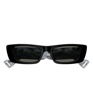 Unisex sunglasses with a refined and contemporary design, characterized by a narrow rectangular shape that enhances the gaze with discretion and style. The frame, with a slender profile, is embellished with precious mother-of-pearl finishes, for a sophisticated and distinctive touch. The Gucci Interlocking logo, clearly visible on the temples, signs the model with elegance. Available in two new SKUs: one version with oblique stripes in black and white mother-of-pearl and one in solid blue, to express personality with class, in the unmistakable style of Gucci.