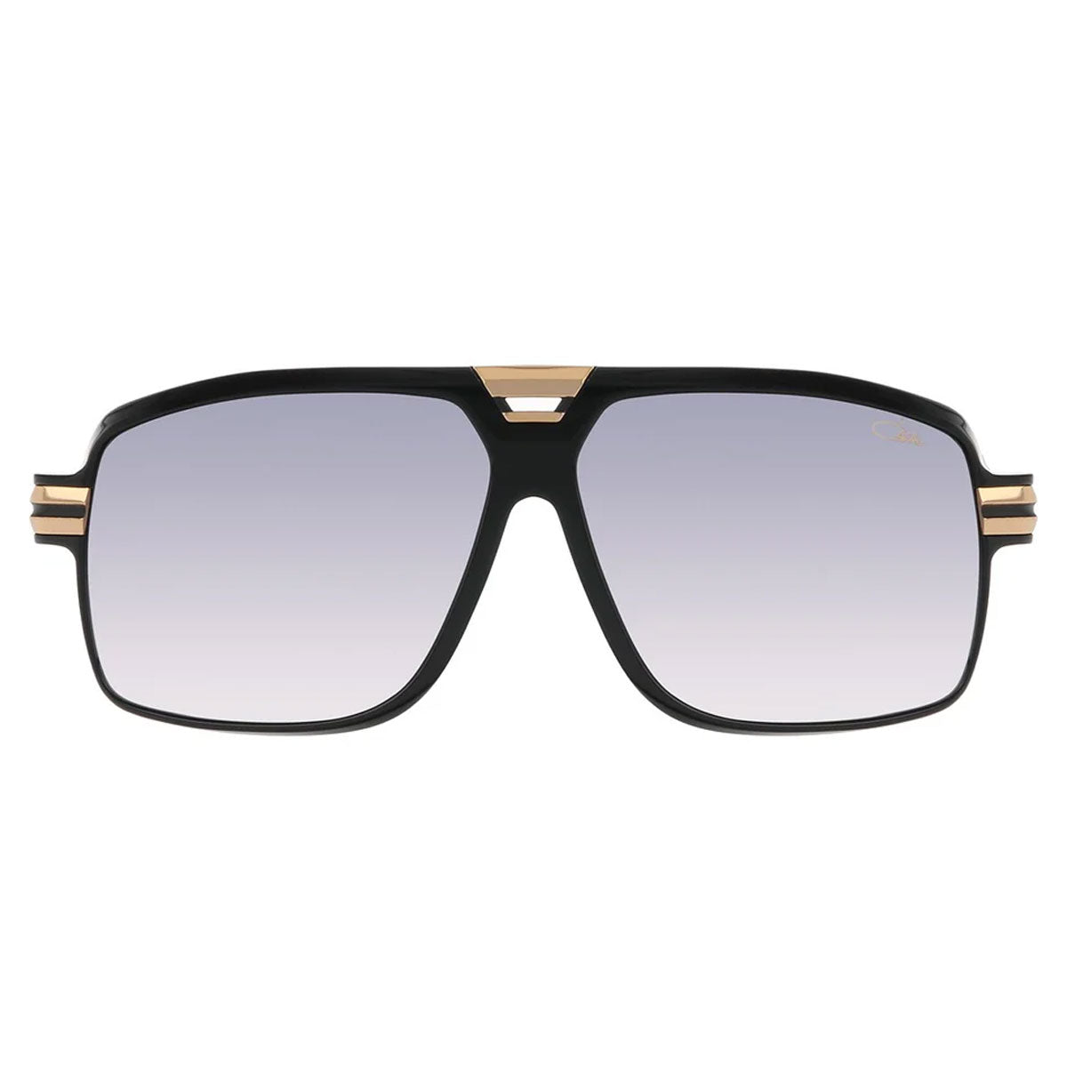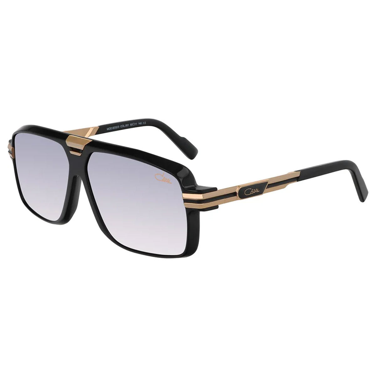 Sunglasses Cazal 6032 001, made of acetate with a pilot shape and metal details. This model combines a unique, vintage, and modern style, perfect for those seeking a distinctive and sophisticated look. The black acetate frame and gold metal create an elegant contrast, while the stunning gradient gray lenses, treated with anti-reflective coating, offer optimal protection and superior visual comfort. A pair of glasses that surely captures even the most demanding glances, with a design that does not go unnoticed.