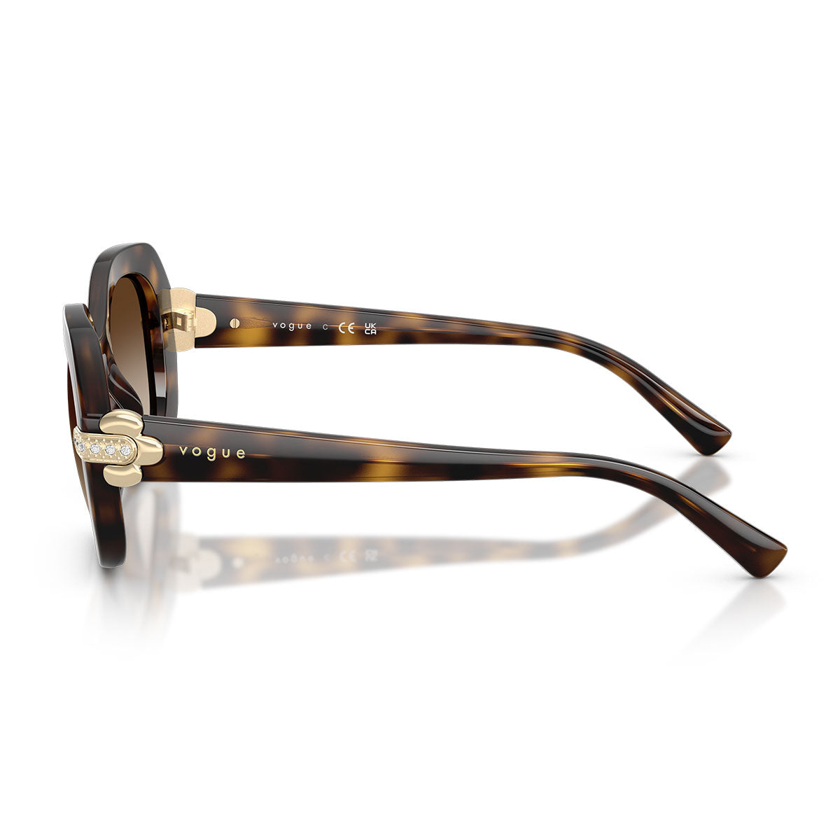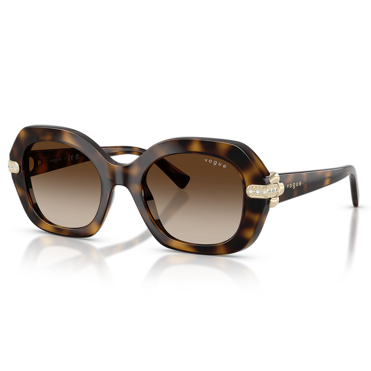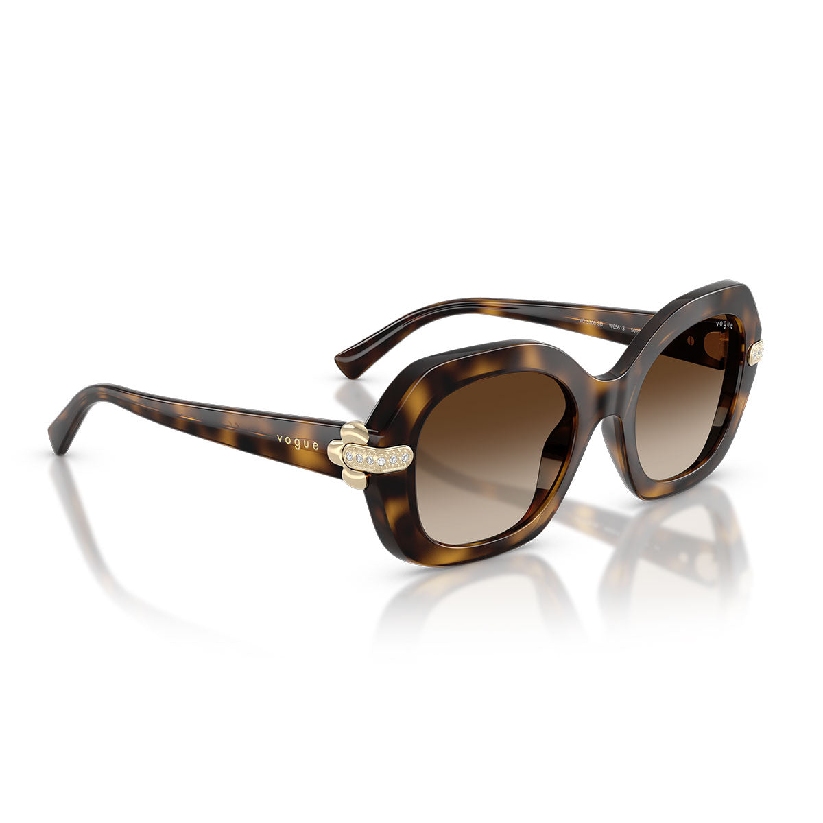 Bold yet refined, the Vogue Sunglasses VO5706SB combine substantial volumes and feminine details in a perfect balance of character and elegance. The oversized silhouette captures the eye, while the temples are adorned with delicate metal details inspired by flowers and small crystals that wrap the endpiece, giving a discreet and sophisticated touch of light.