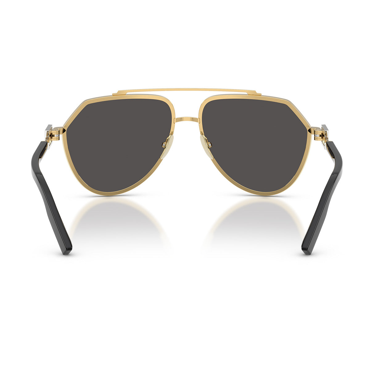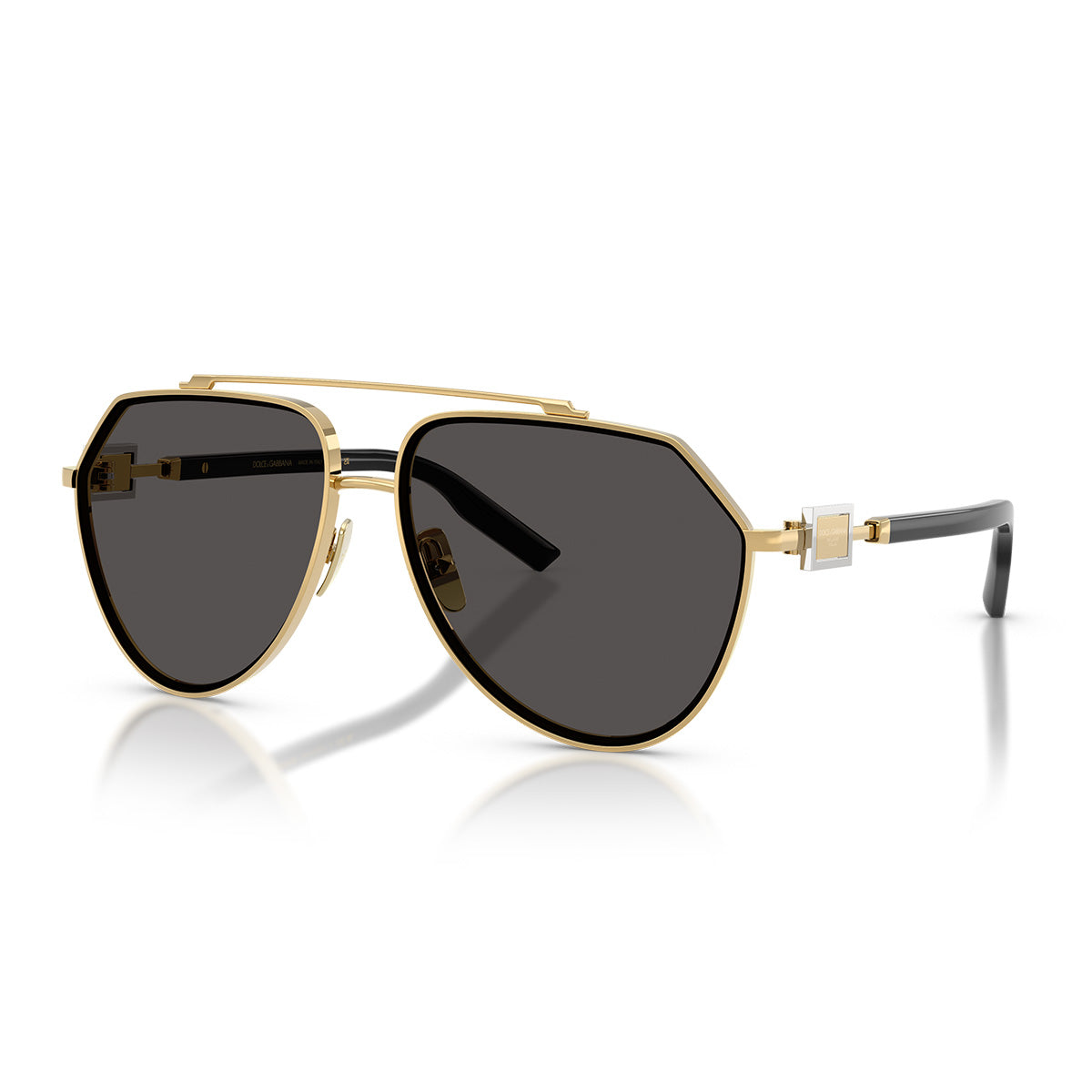 La icónica plaquita con el logo Dolce & Gabbana decora las patillas, integrándose armoniosamente en el diseño de la bisagra. Las puntas de acetato aseguran comodidad y un toque de elegancia, mientras que las lentes oscuras combinan con acabados metálicos bicolor, disponibles en variantes plateadas o chapadas en oro.