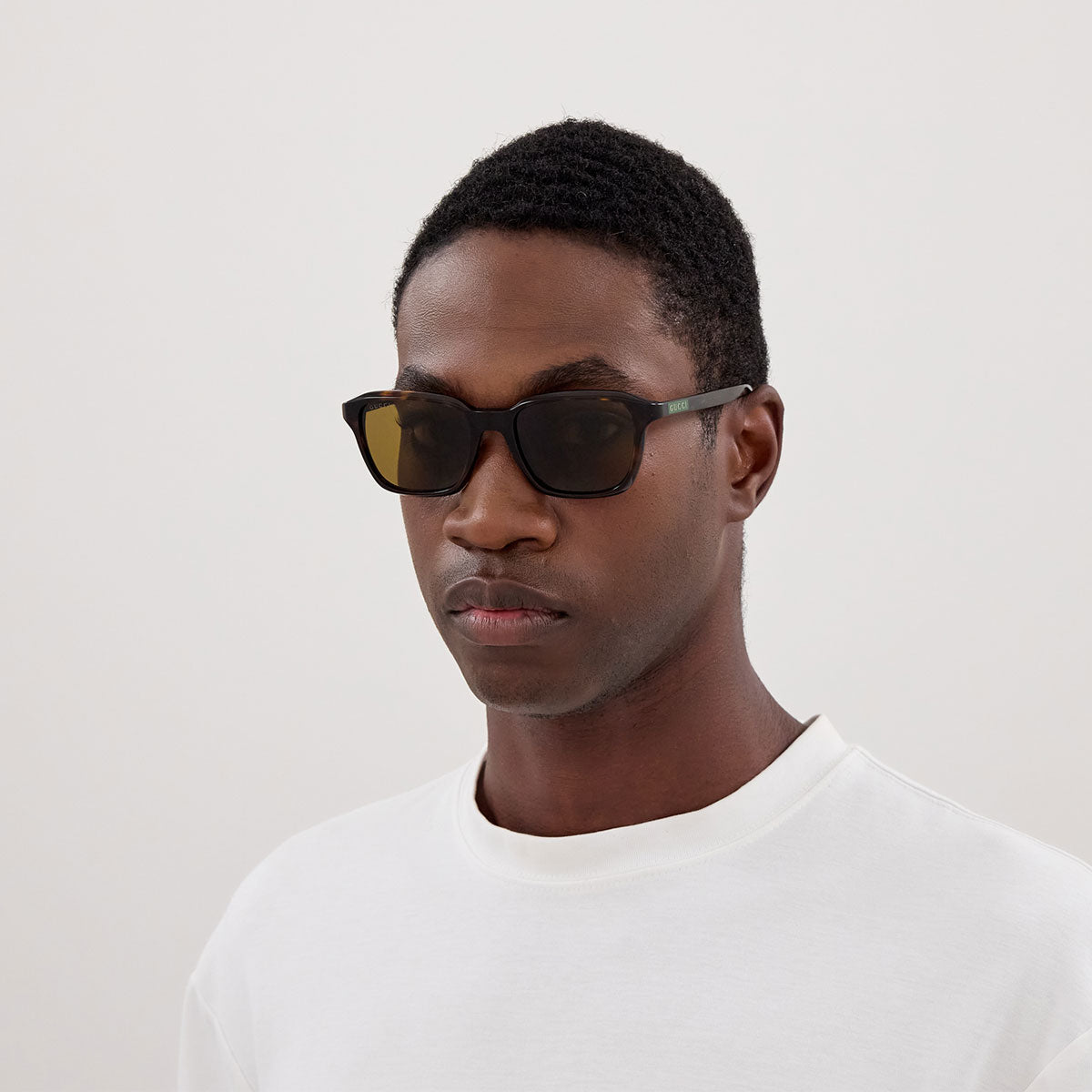 La forma cuadrada masculina define el rostro con carácter, mientras que la placa con el logo Gucci aplicada en ambas varillas subraya la identidad icónica de la marca. El emblema institucional Gucci, bien visible en ambos lados, se convierte en protagonista de un diseño audaz y de gran impacto visual.