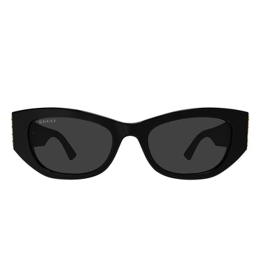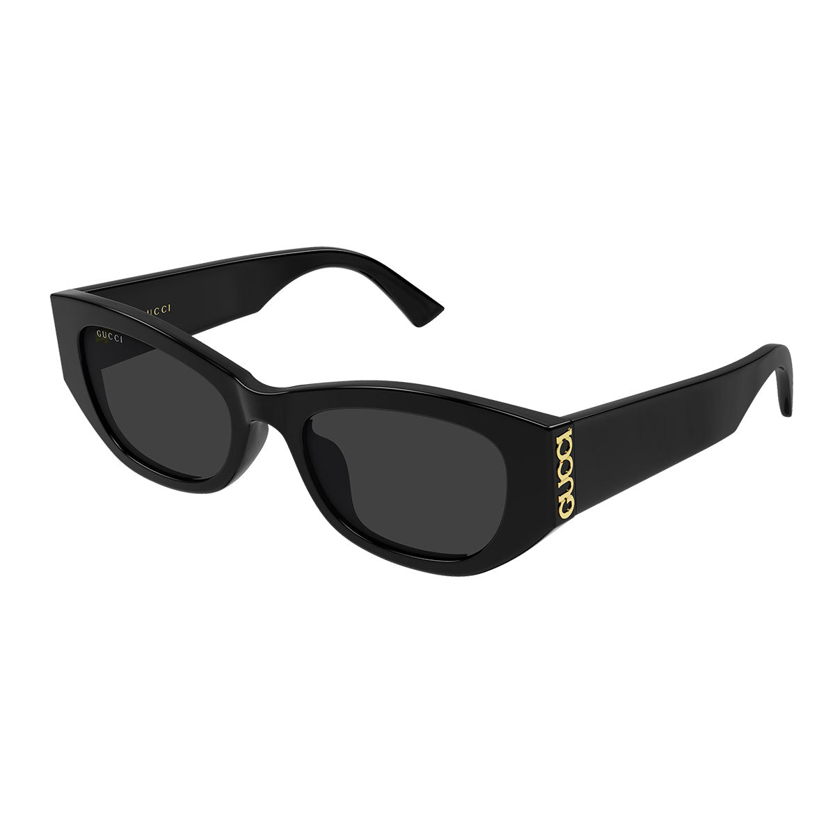 La monture en acétate présente une épaisseur importante qui permet de valoriser le logo métallique Gucci, positionné latéralement sur les deux branches. Ce détail iconique ajoute une touche de luxe discret et rend le modèle immédiatement reconnaissable.