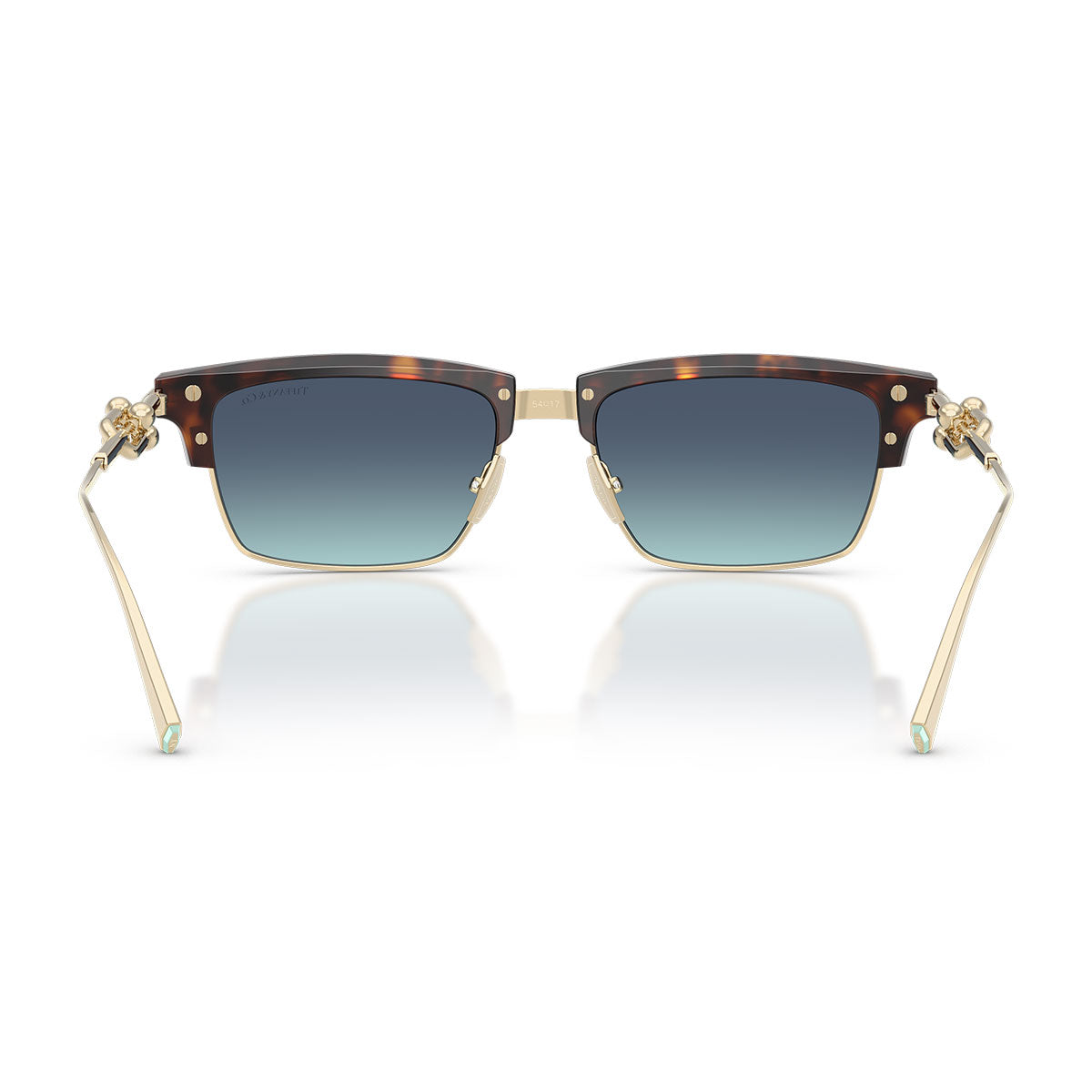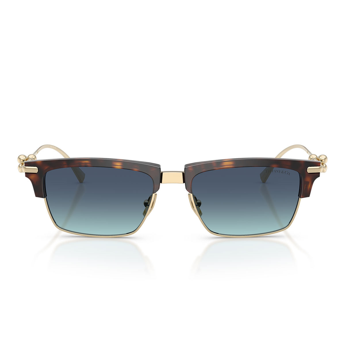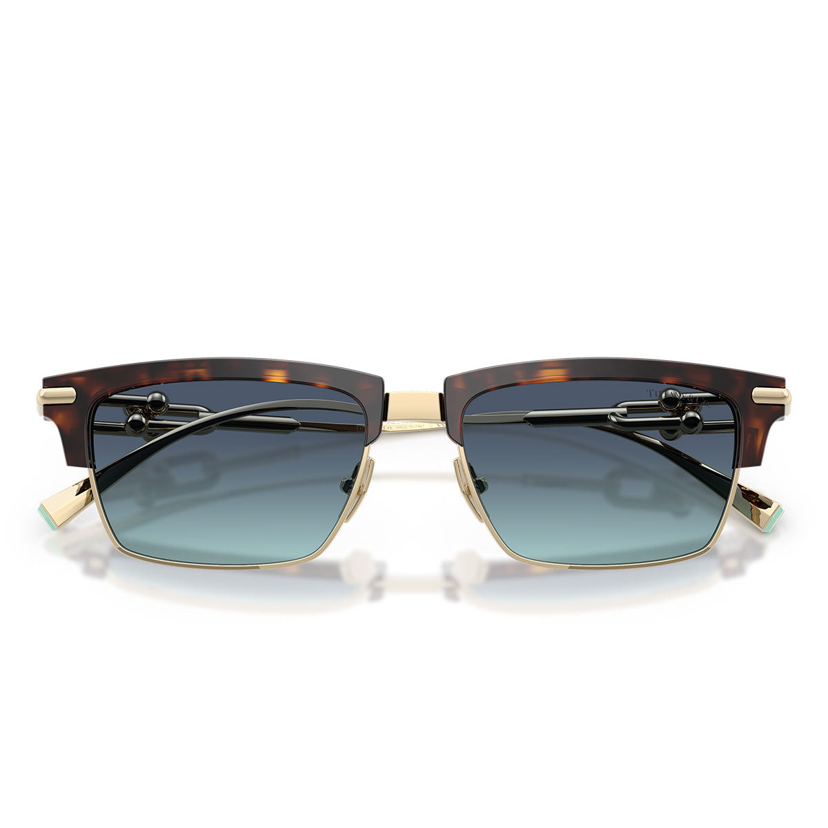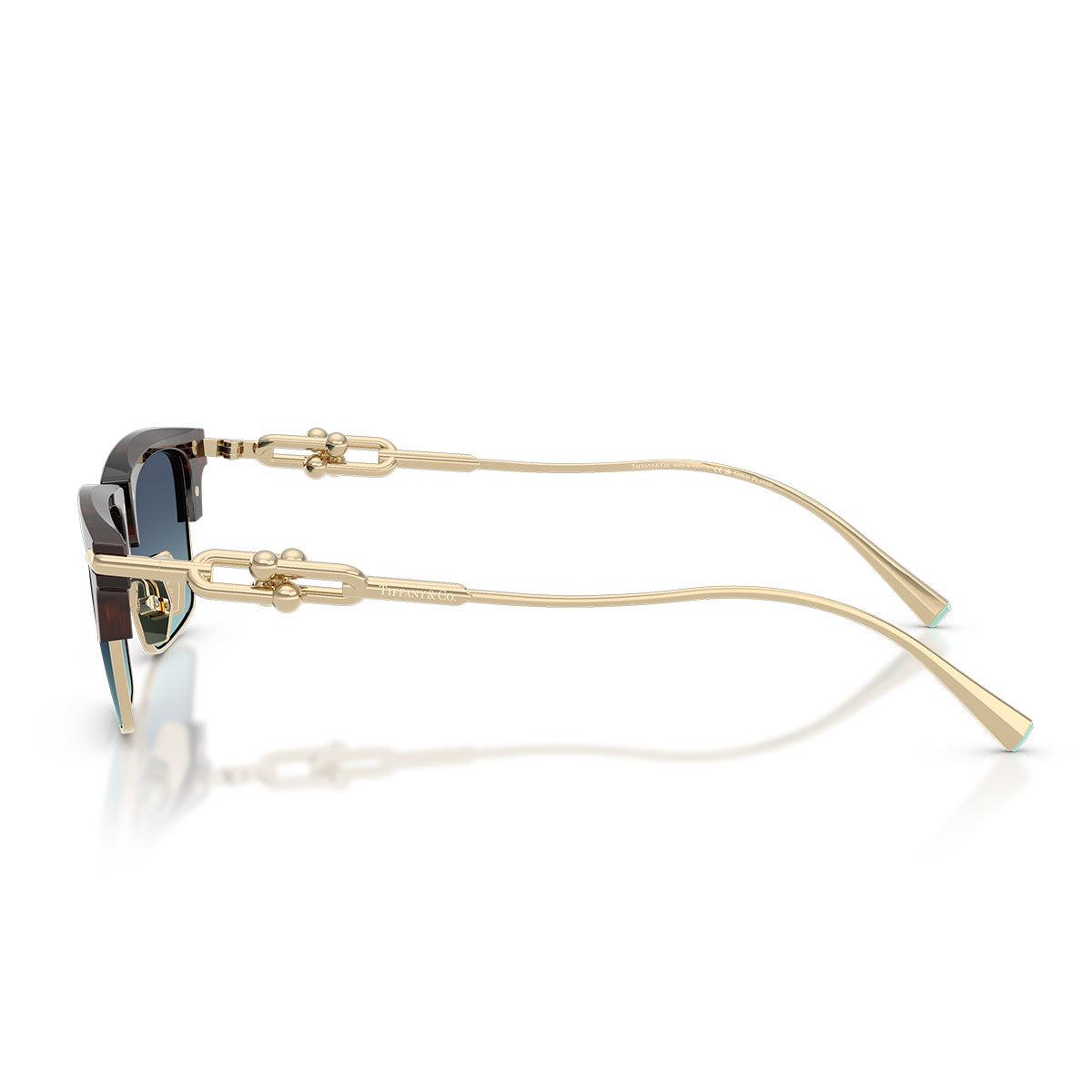 La monture en métal avec finition galvanique plaquée or apporte luminosité et prestige, tandis que la face métallique est enrichie d’un brow en acétate, créant un contraste raffiné entre les matériaux. Les branches présentent l’iconique gauge link HardWear, élément distinctif qui évoque l’univers de la joaillerie Tiffany et sert de détail structurel et décoratif.