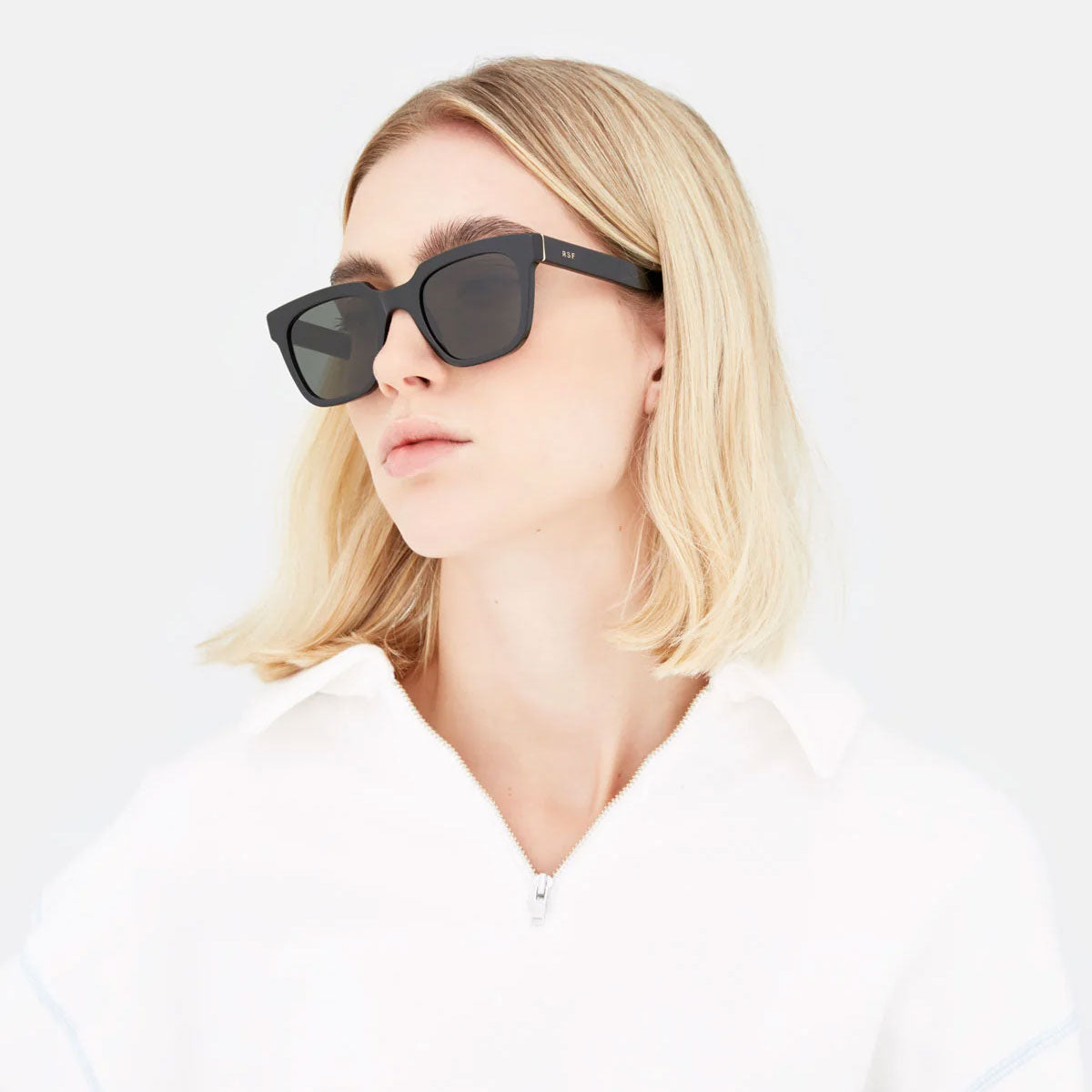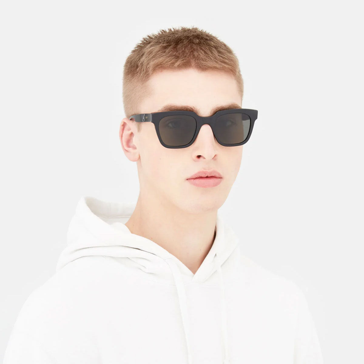 Wykonane z grubego i wytrzymałego acetatu, te okulary posiadają szerokie geometryczne soczewki, które nadają zdecydowany i wyrafinowany wygląd. W tej wersji oprawki z czarnego błyszczącego acetatu łączą się z czarnymi soczewkami, tworząc odważny i wyróżniający się styl.
